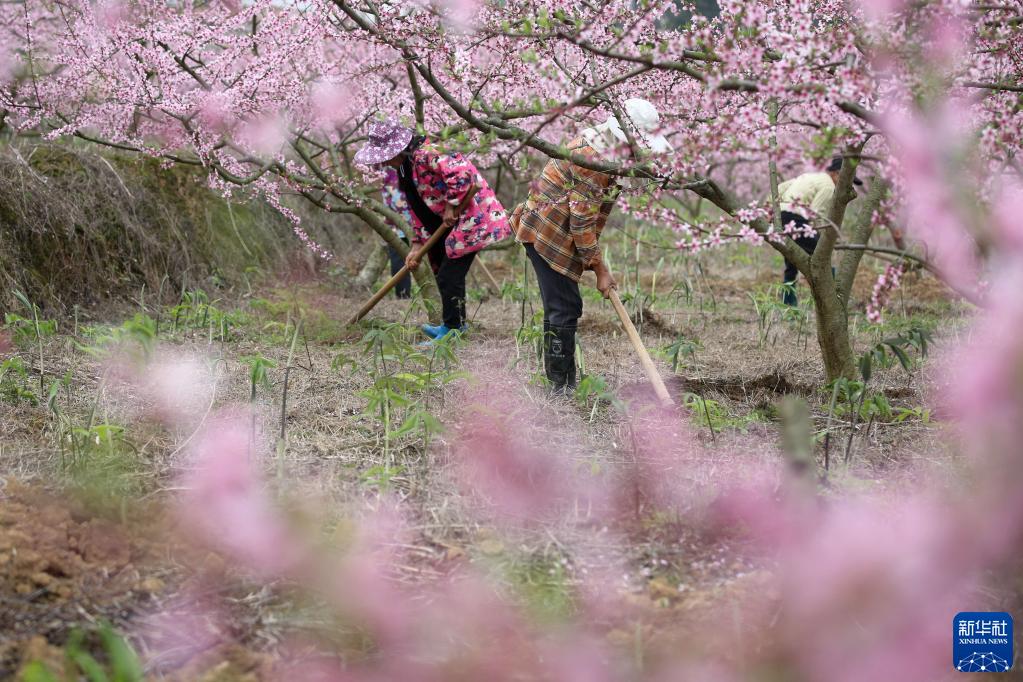 3月31日,在貴州省銅仁市玉屏侗族自治縣皂角坪街道甕陽(yáng)村,村民在花間勞作。