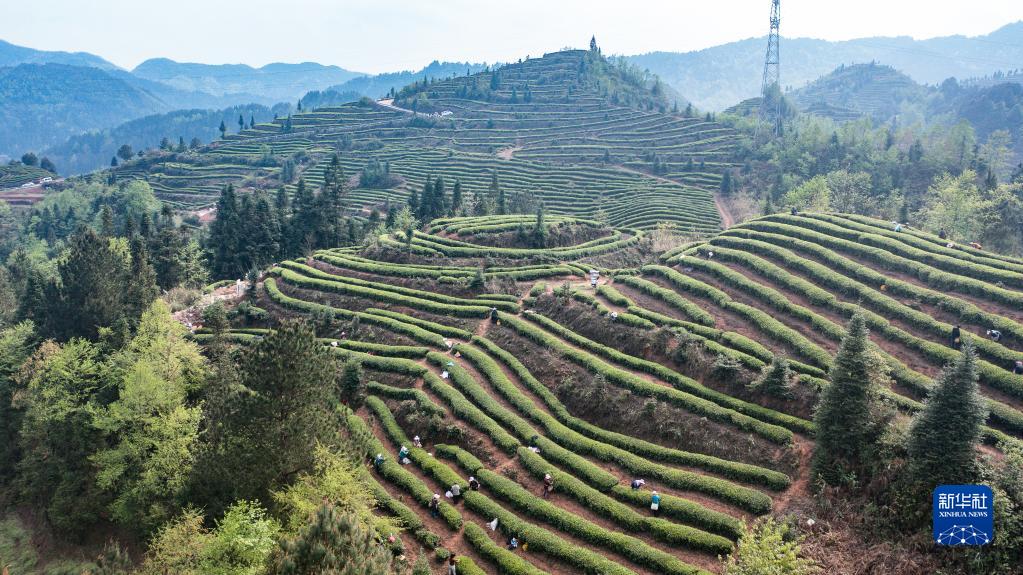 茶農在六盤(pán)水市六枝特區月亮河彝族布依族苗族鄉花德村茶園采摘春茶(3月31日攝,無(wú)人機照片)。