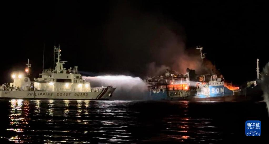3月30日,在菲律賓南部巴西蘭省附近海域,菲律賓海岸警衛隊船只向起火的渡輪實(shí)施滅火救援。