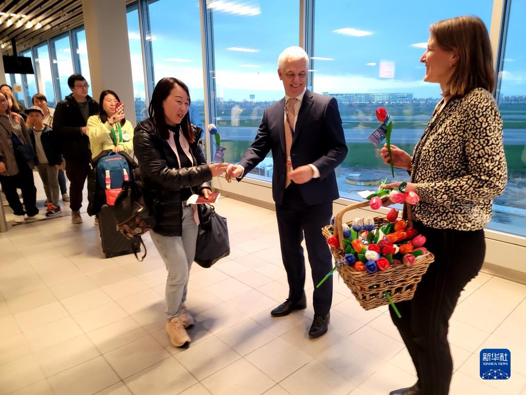 3月26日,在荷蘭阿姆斯特丹史基浦機場(chǎng),機場(chǎng)代表向乘坐阿姆斯特丹直飛北京大興國際機場(chǎng)南航航班的旅客和機組人員發(fā)放荷蘭特色紀念品——彩繪木質(zhì)郁金香。