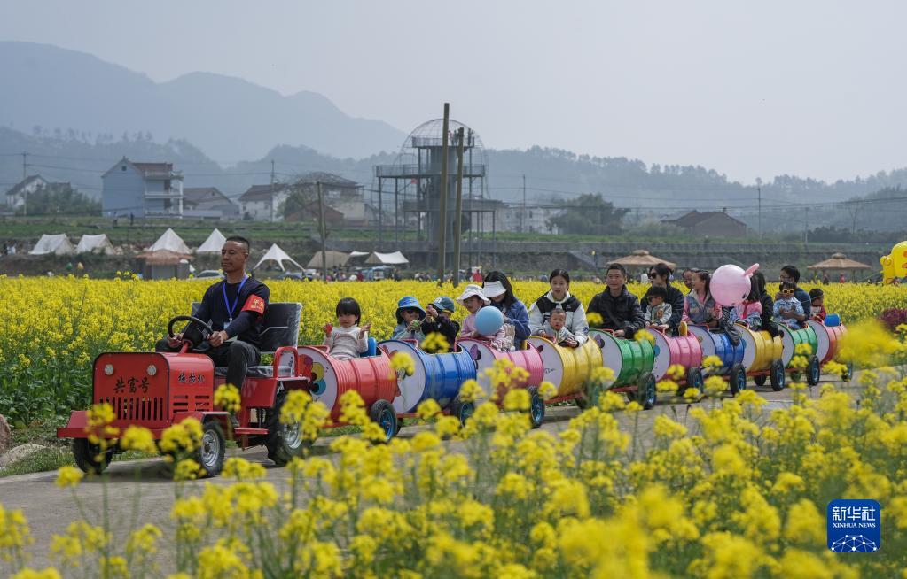 4月1日,游客乘坐田野小火車(chē)在油菜花地里感受春日美景。