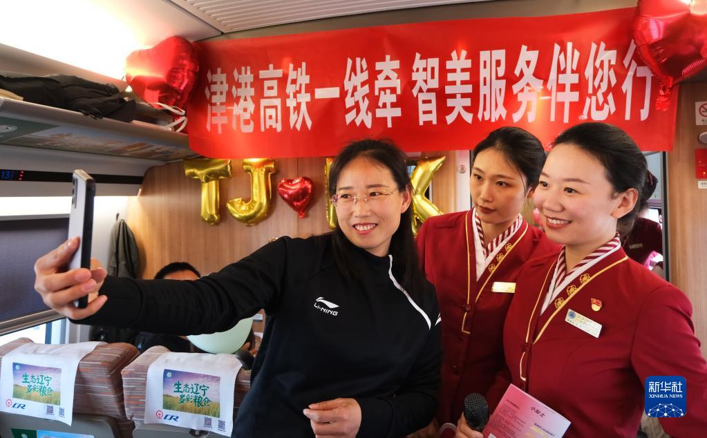 4月1日,在天津西至香港西九龍G305次列車(chē)上,旅客與乘務(wù)人員拍照留念。