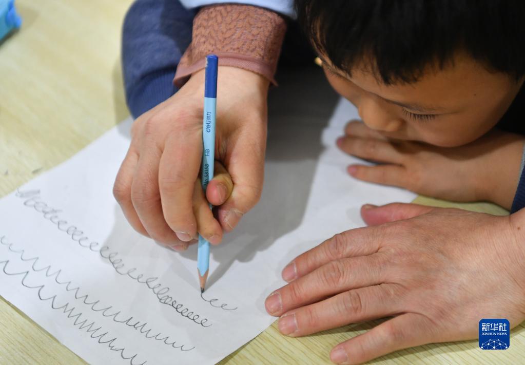 3月30日,在西安市金色陽(yáng)光康復中心,特教老師指導孩子進(jìn)行繪畫(huà)練習。
