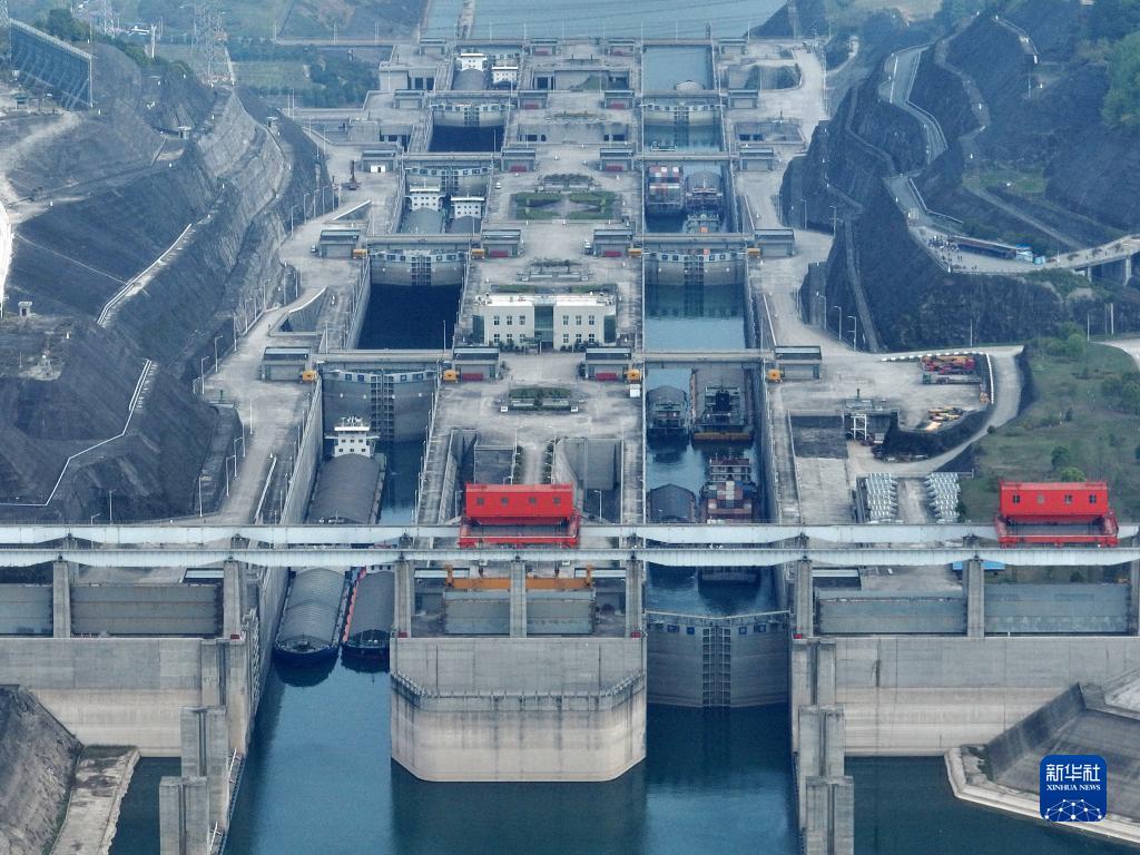 4月1日,船舶有序通過(guò)三峽雙線(xiàn)五級船閘(無(wú)人機照片)。
