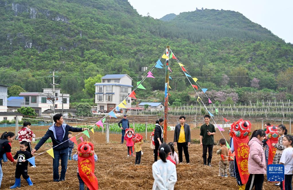 4月1日,在柳江區進(jìn)德鎮龍新村龍朝屯,小朋友在家長(cháng)陪同下立起豐收柱。