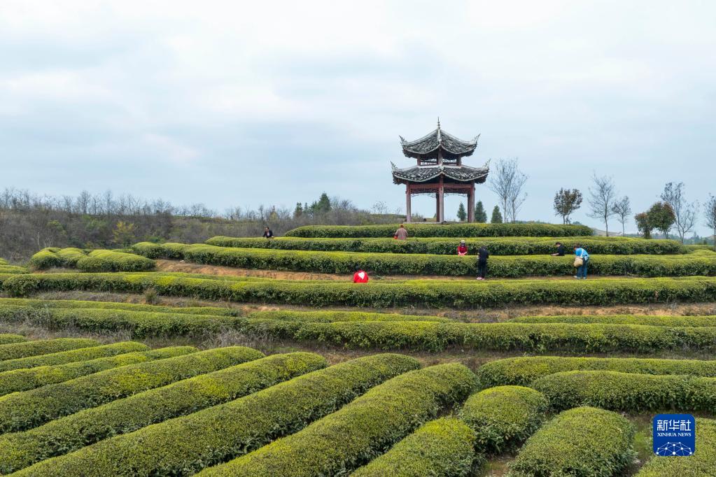 4月1日,村民在岑鞏縣天馬鎮一茶葉種植基地采摘明前茶(無(wú)人機照片)。