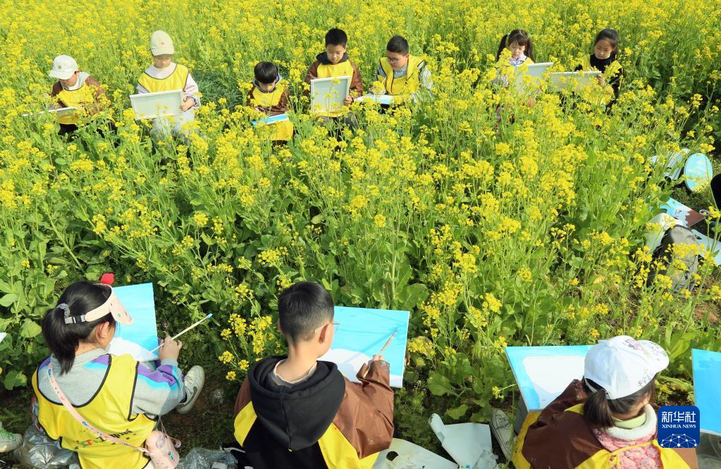 4月1日,在汝陽(yáng)縣三屯鎮東保村千畝油菜花田,小學(xué)生坐在花叢中寫(xiě)生。