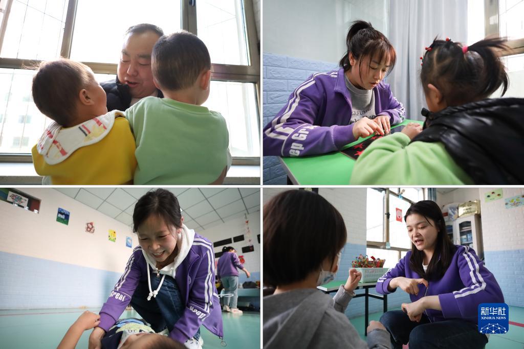 3月31日,蘭州欣雨星兒童心理發(fā)展中心的特教老師們?yōu)楣陋毎Y兒童進(jìn)行康復訓練(拼版照片)。