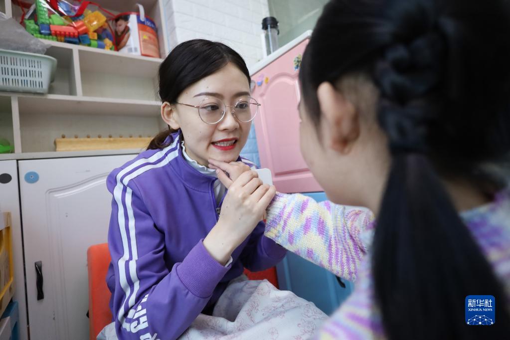 3月30日,特教老師陳進(jìn)為孤獨癥兒童指導發(fā)音訓練。