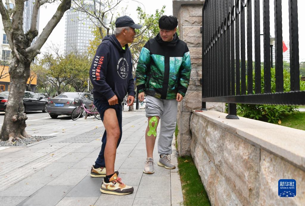 為準備明日開(kāi)賽的廈門(mén)馬拉松,高振海(左)在與跑友交流跑馬拉松的技巧(4月1日攝)。