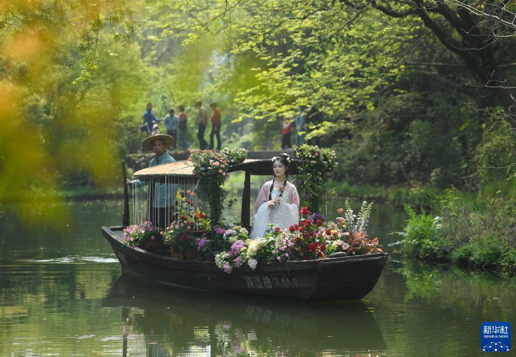 4月2日,漢服愛(ài)好者在西溪濕地內乘船巡游。