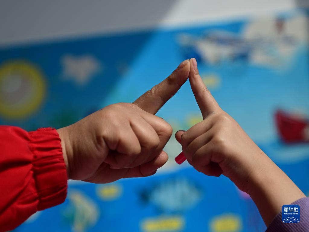 3月30日,在青海省西寧市星光特殊兒童服務(wù)中心,陳志芳(左)與一名孤獨癥兒童手指接觸做認知訓練。