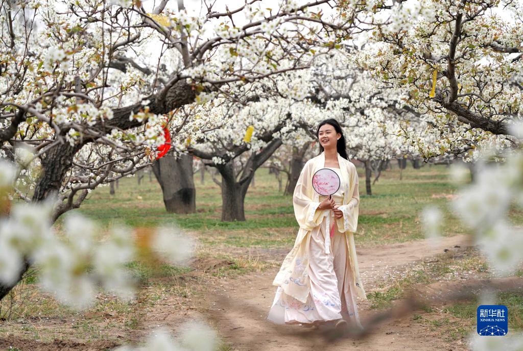4月2日,游客身著(zhù)古裝在臨城縣北程村百年梨園賞花游玩。