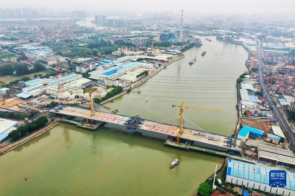 東莞槎馬特大橋主跨合龍段施工現場(chǎng)(4月2日攝,無(wú)人機照片)。