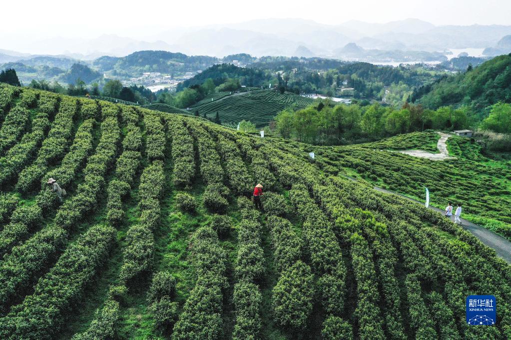 4月2日,村民在貴州省貴陽(yáng)市神鵲茶場(chǎng)采摘春茶(無(wú)人機照片)。