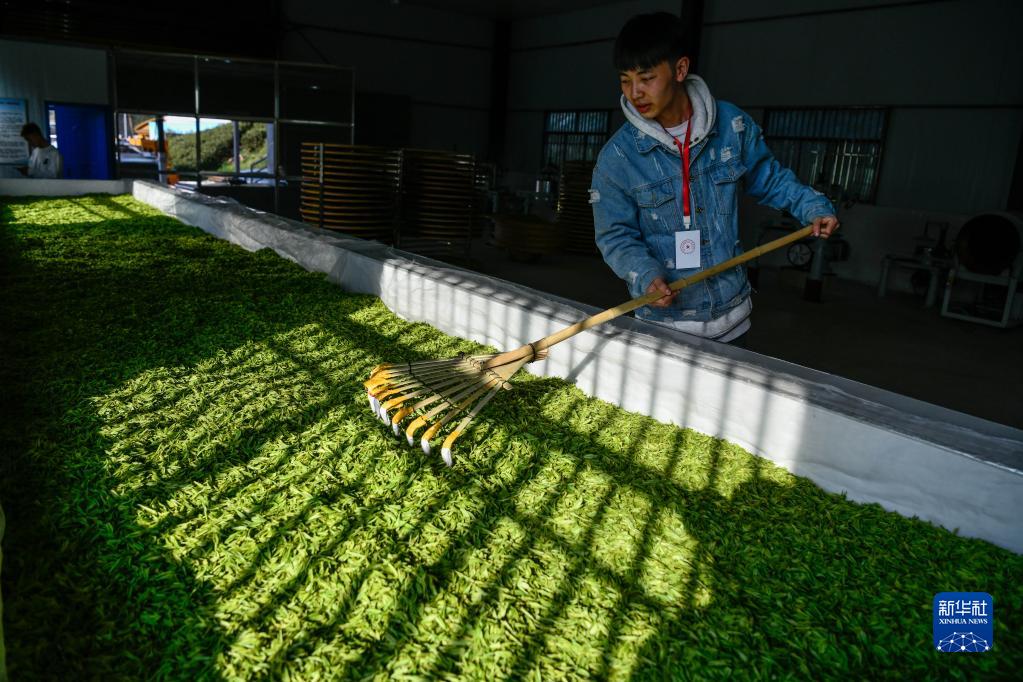 4月2日,工人在貴州省貴陽(yáng)市神鵲茶場(chǎng)攤晾春茶。