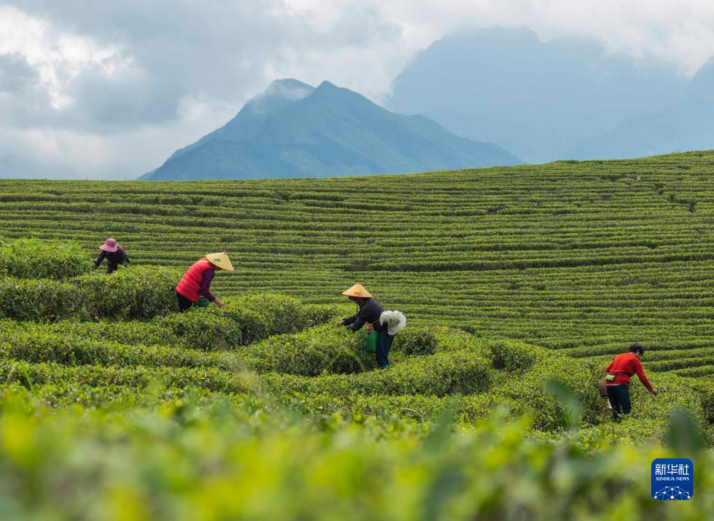 4月2日,采茶工在湖南省永州市江華瑤族自治縣濤圩鎮牛牯嶺生態(tài)茶場(chǎng)采摘春茶。