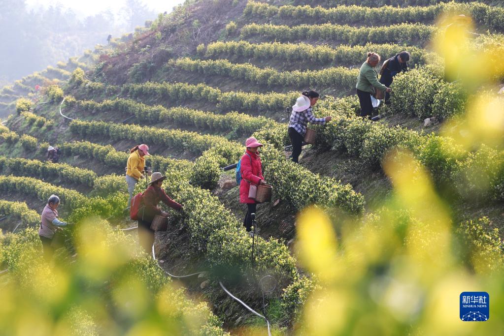 4月1日,村民在湖南省衡陽(yáng)市衡山縣開(kāi)云鎮雙全新村生態(tài)茶場(chǎng)采摘春茶。