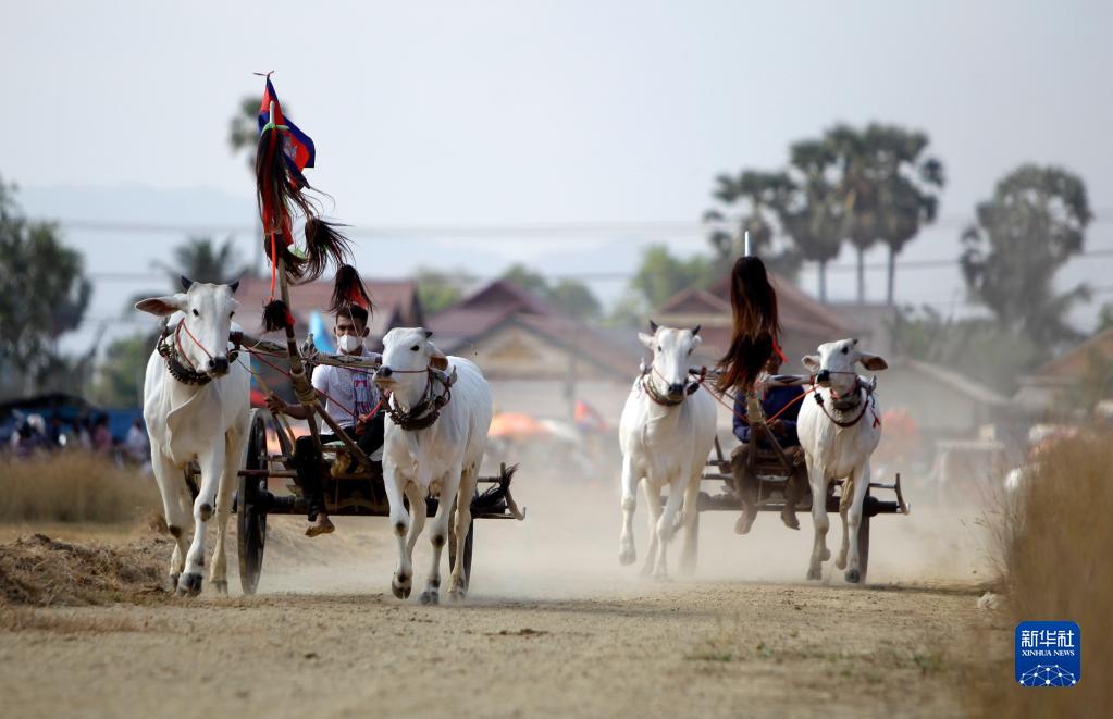 4月2日,在柬埔寨南部磅士卑省,當地農民參加趕牛車(chē)比賽。