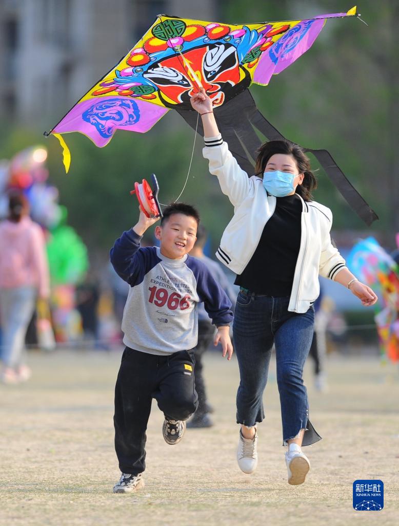 4月1日,家長(cháng)帶著(zhù)孩子在山東省滕州市市民廣場(chǎng)放風(fēng)箏。