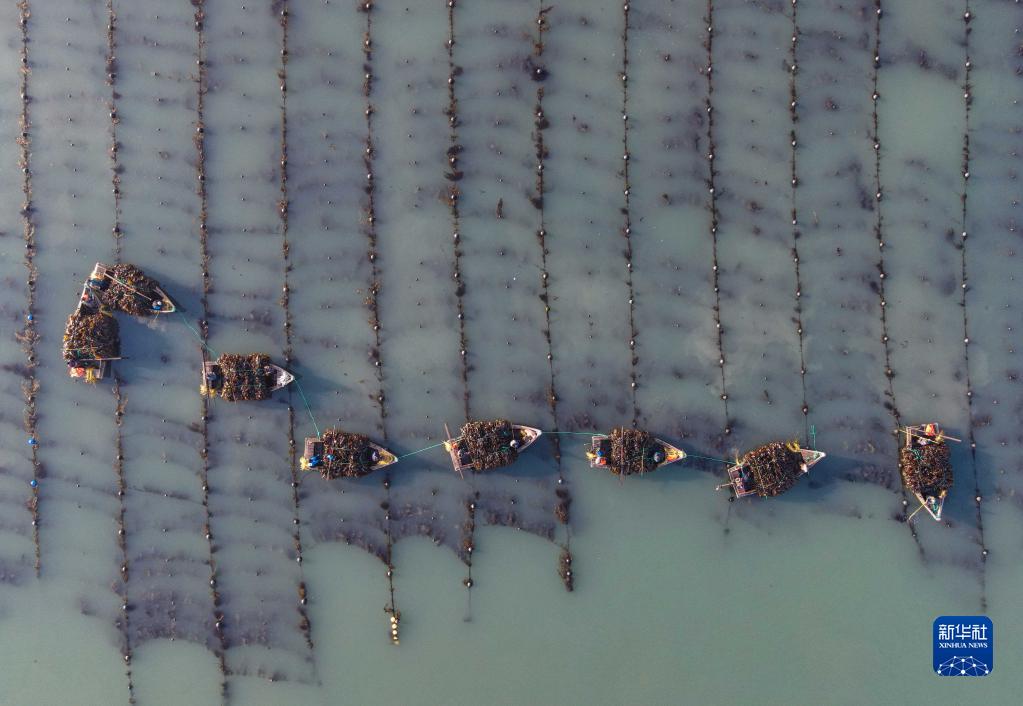4月2日,在榮成市成山鎮海域海帶養殖區,養殖工人們收獲海帶(無(wú)人機照片)。