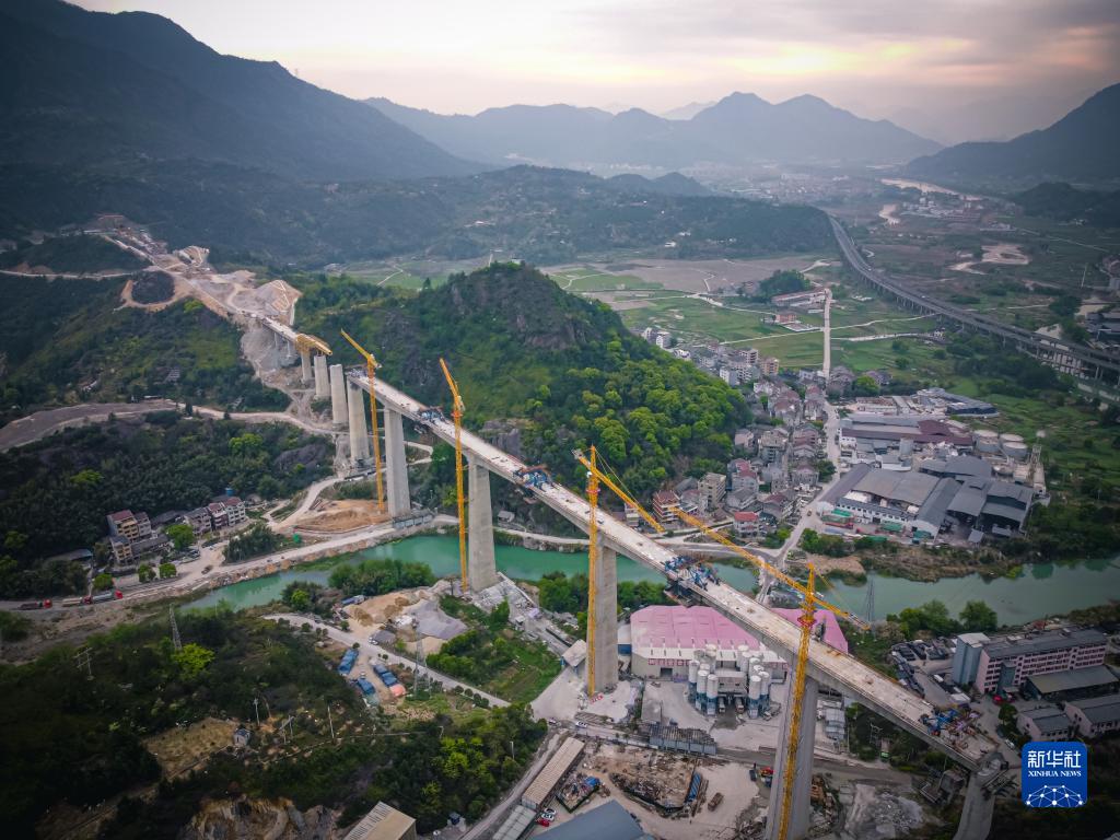 4月3日拍攝的位于溫州市永嘉縣的杭溫鐵路陡門(mén)溪特大橋施工現場(chǎng)(無(wú)人機照片)。陡門(mén)溪特大橋連續梁于4月1日凌晨順利合龍。