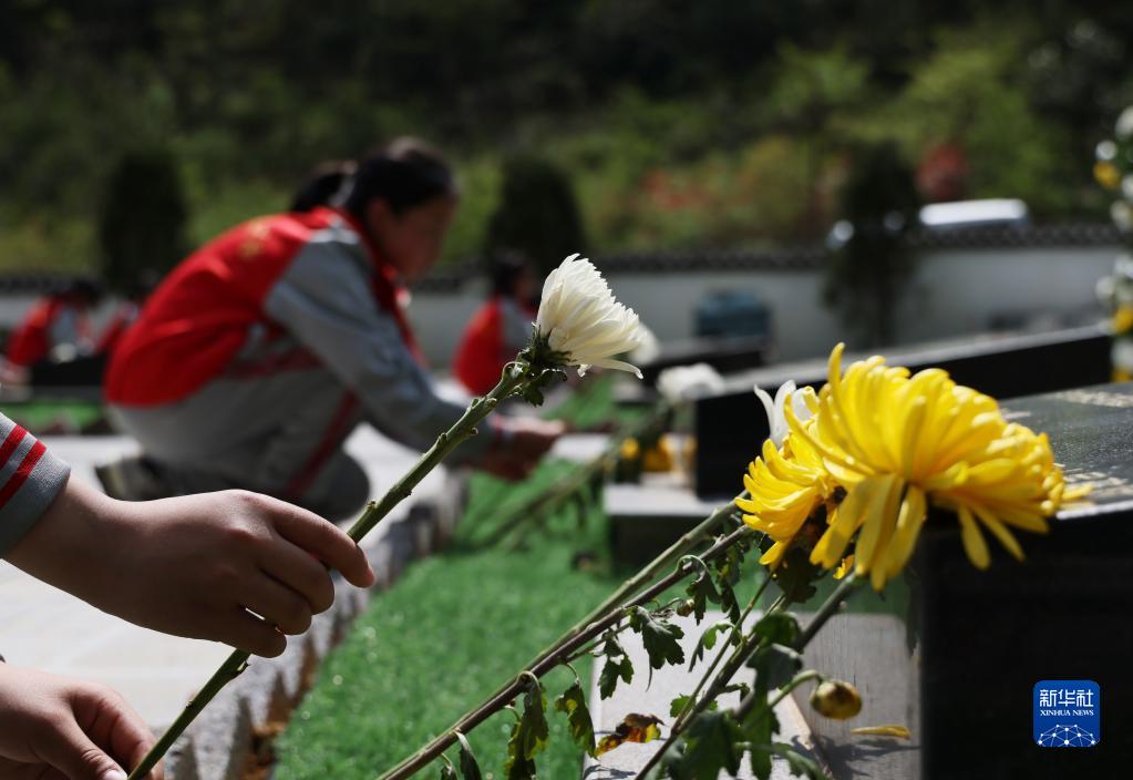4月3日,學(xué)生在貴州省遵義市匯川區婁山關(guān)烈士紀念園向先烈敬獻鮮花。