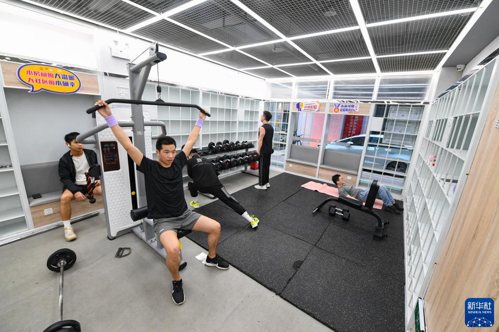 4月2日,在深圳市龍華區元芬村,青年公寓住戶(hù)在社區增設的健身房鍛煉。