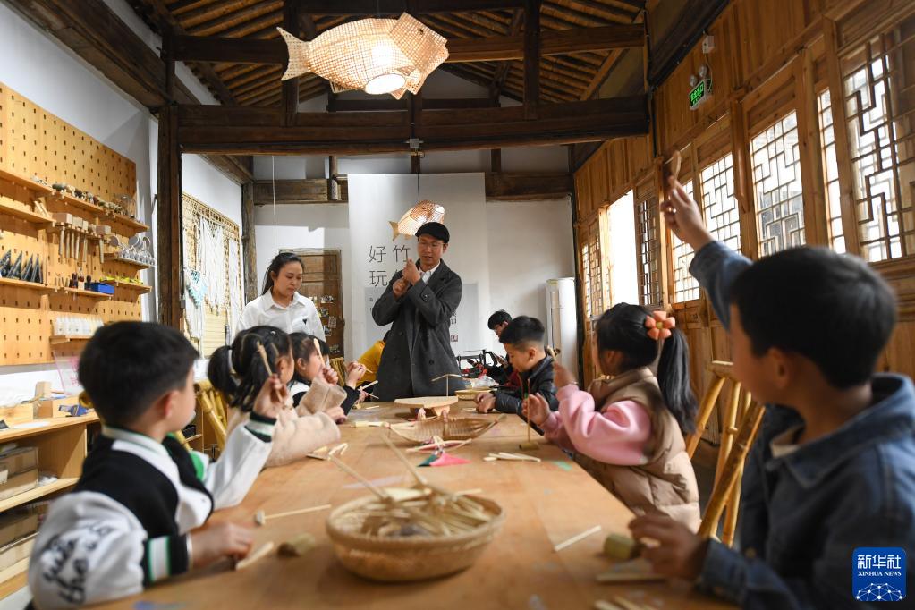 4月3日,姜鵬指導前來(lái)研學(xué)的小學(xué)生制作竹蜻蜓。新華社記者 翁忻旸 攝