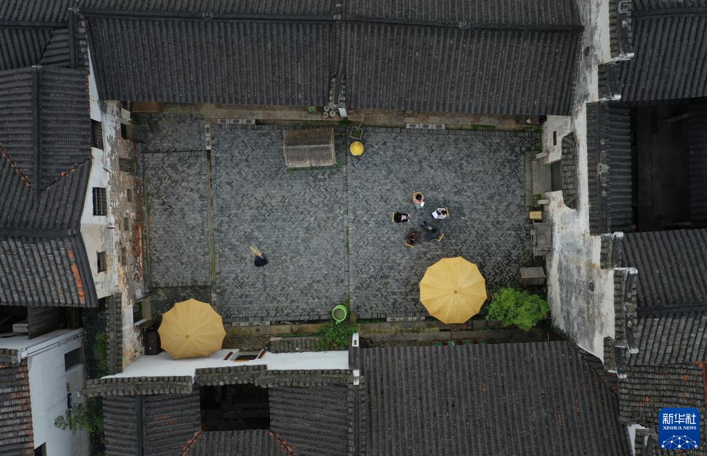 4月3日,幾名老街青年創(chuàng )客聚集在姜鵬工作室交流心得體會(huì )(無(wú)人機照片)。新華社記者 翁忻旸 攝