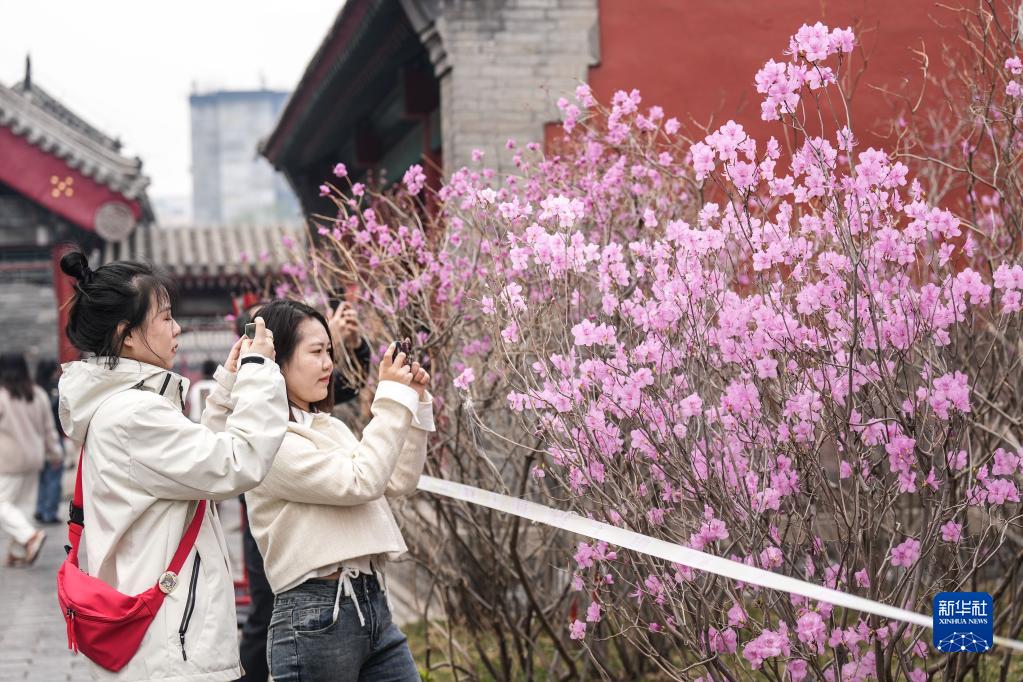 4月4日,游客在沈陽(yáng)故宮賞花拍照。