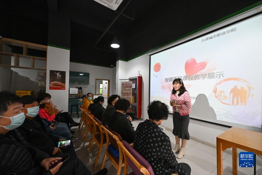 4月4日,在天津市河西區下瓦房街道居家養老服務(wù)中心,授課教師為老人們提供智能手機應用教學(xué)服務(wù)。