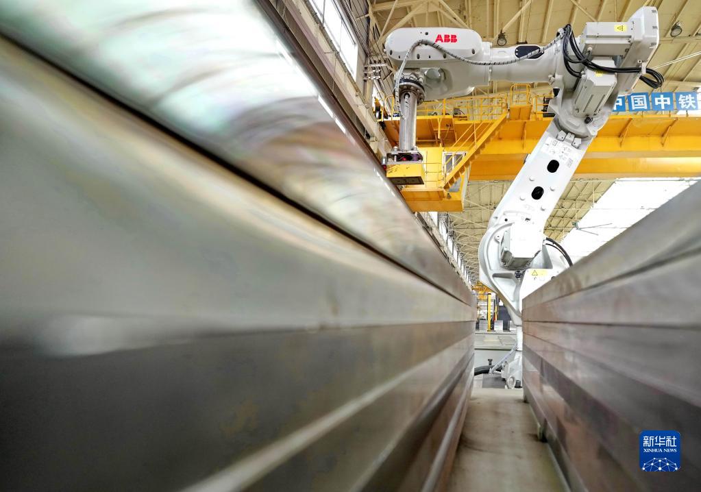4月4日,秦皇島市山海關(guān)區中鐵山橋集團有限公司高速道岔墊板生產(chǎn)線(xiàn)上的機器人在工作中。