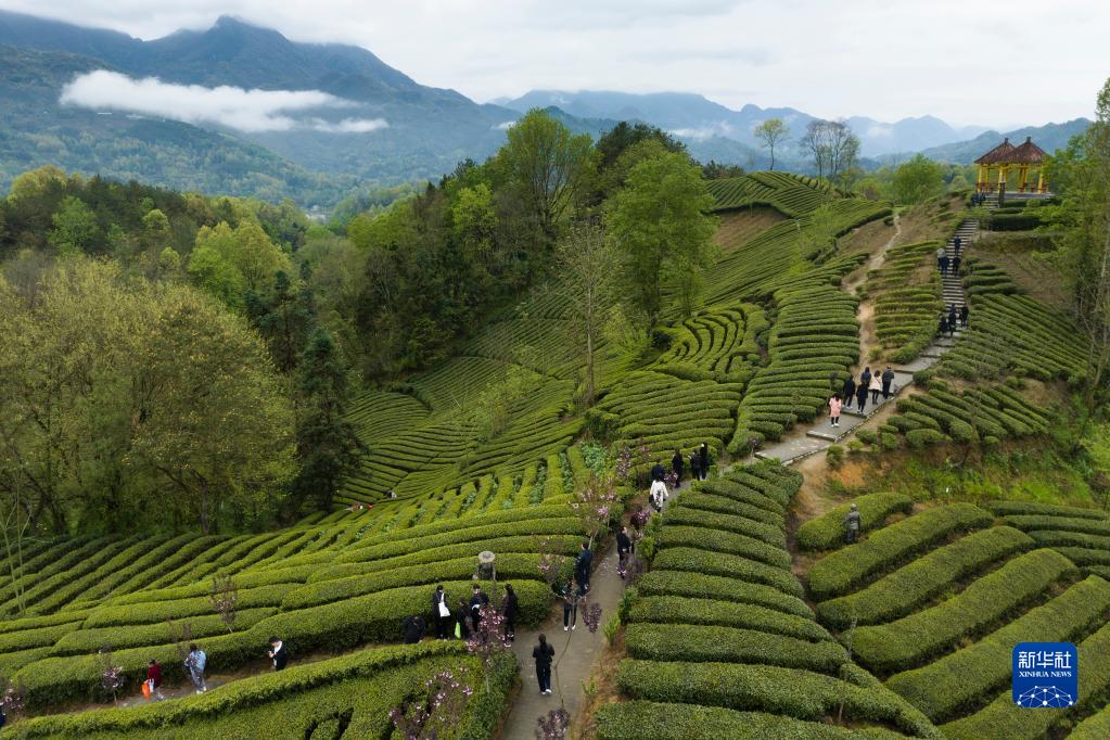 4月4日,游人在西鄉縣峽口鎮茶園內游玩(無(wú)人機照片)。