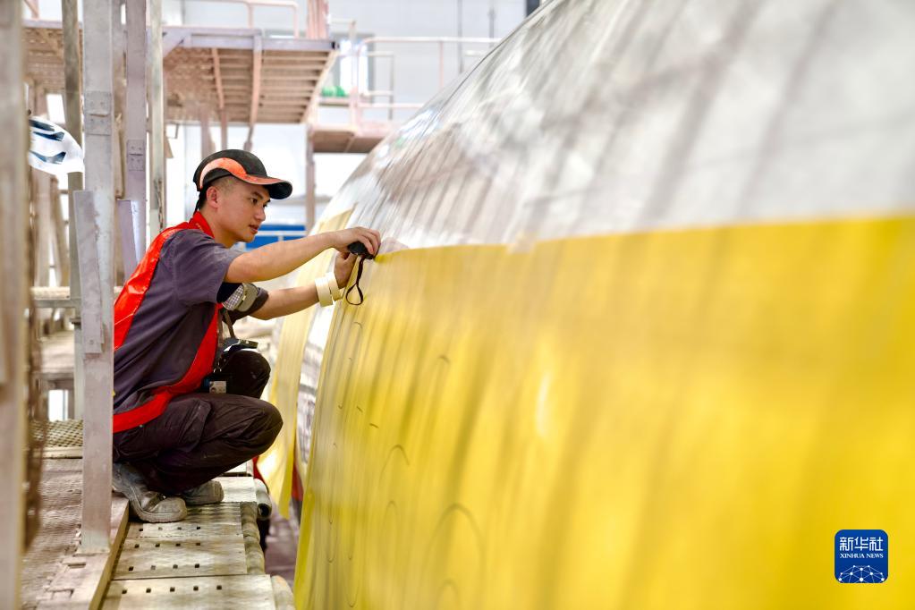 4月3日,在海南自貿港一站式飛機維修產(chǎn)業(yè)基地內,機務(wù)噴涂人員給進(jìn)境飛機安裝機身噴涂模板。