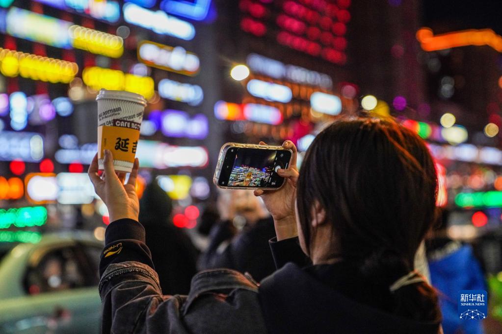 4月4日,游客們手拿咖啡在延吉市打卡拍照。