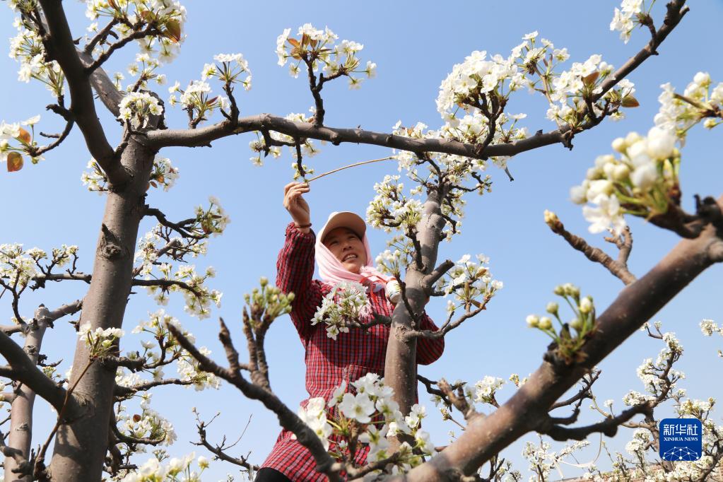 4月5日,山東省濱州市惠民縣清河鎮一家林果種植專(zhuān)業(yè)合作社的梨農在給梨花進(jìn)行人工授粉。