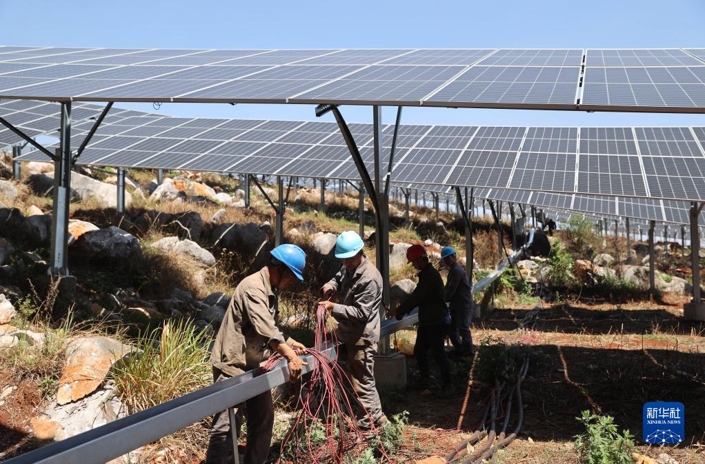 4月6日,工人在硯山縣平遠小石巖光伏電站安裝電線(xiàn)。