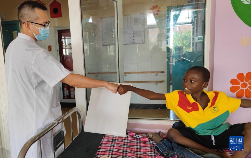 2月23日,在塞內加爾迪亞姆尼亞久兒童醫院,中國第19批援塞內加爾醫療隊內科醫生郭良華與患兒碰拳示意。