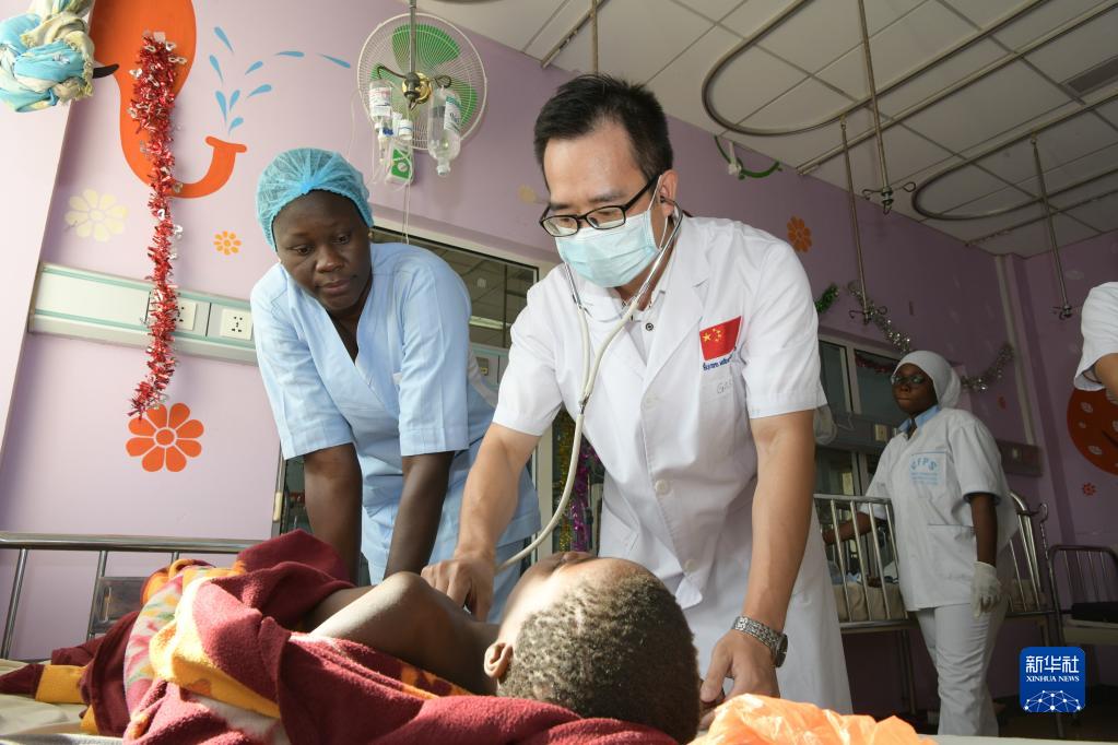 3月22日,在塞內加爾迪亞姆尼亞久兒童醫院,中國第19批援塞內加爾醫療隊內科醫生郭良華為患兒做檢查。