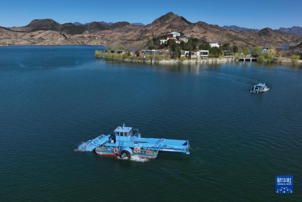 4月7日,河北省遵化市上關(guān)湖管理部門(mén)的工人操作專(zhuān)業(yè)打撈船在湖面上作業(yè)(無(wú)人機照片)。