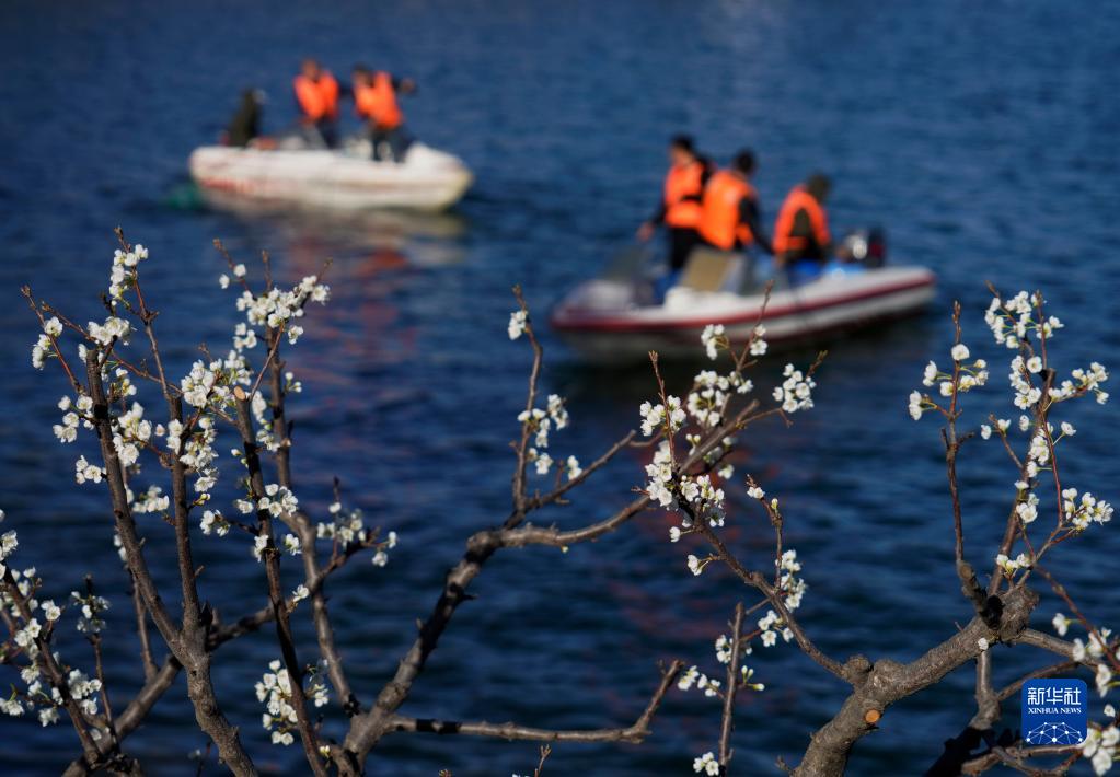 4月7日,河北省遵化市上關(guān)湖管理部門(mén)的工人在打撈湖面漂浮物。