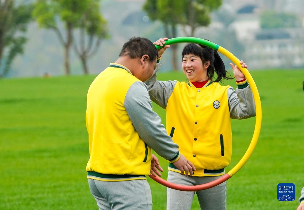 3月31日,重慶廣陽(yáng)島的一片草地上,重慶市特殊教育中心視力障礙學(xué)生們在玩呼啦圈。
