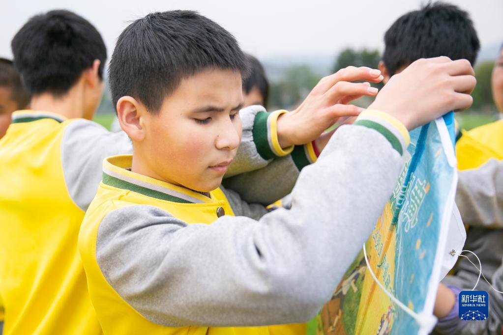3月31日,在重慶廣陽(yáng)島,重慶市特殊教育中心的視力障礙學(xué)生在草坪上觸摸風(fēng)箏。