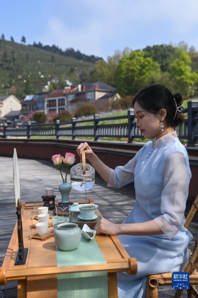 4月7日,工作人員在安頂村共富工坊外進(jìn)行茶藝表演。