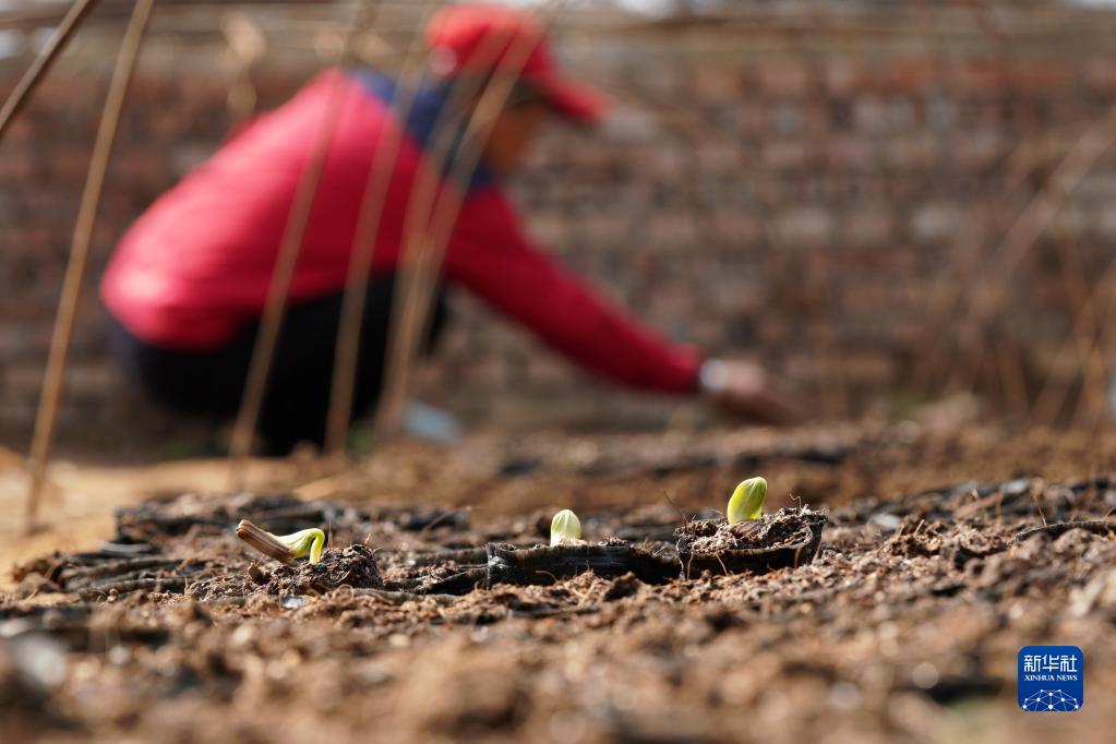 4月7日,邢臺市信都區會(huì )寧鎮張爾莊村村民在管護葫蘆苗。