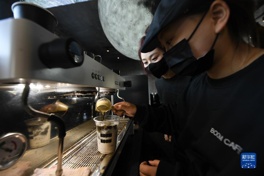 4月7日,安吉縣上墅鄉羅村一咖啡館的工作人員在為顧客制作飲品。