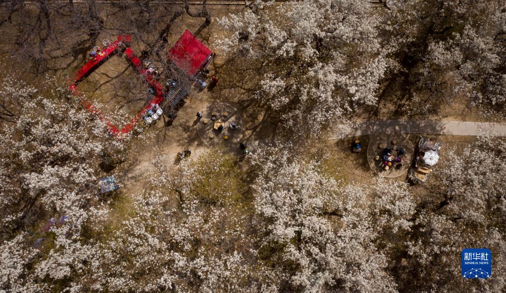 4月7日,游客在南長(cháng)灘村賞花休閑(無(wú)人機照片)。
