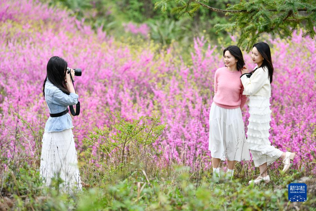 4月7日,游人在貴州省岑鞏縣天馬鎮玉門(mén)洞景區的紫荊花園賞花拍照。