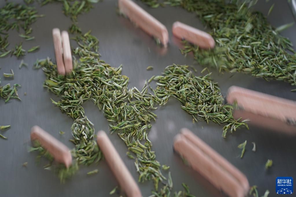 漢中市南鄭區青樹(shù)鎮一家茶企生產(chǎn)線(xiàn)上加工的茶葉(4月5日攝)。